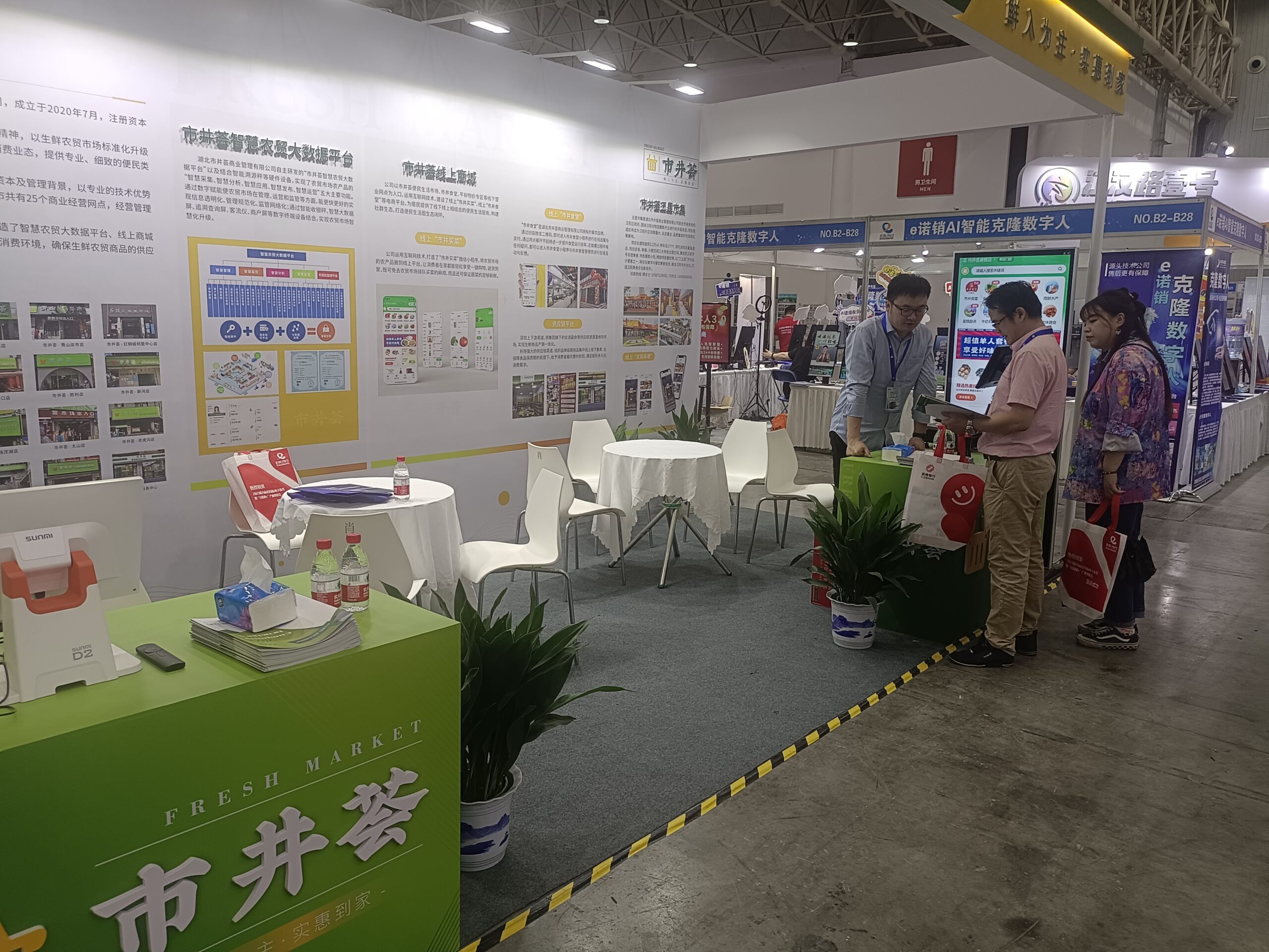 本次武汉电博会上,湖北市井荟商业管理有限公司携专业技术优势构建的线上平台及物联网供应链体系服务整体亮相,吸引了诸多业内专业人员的目光。其中,市井荟智慧农贸大数据平台、市井荟线上商城、市井食堂在线支付与智能服务、汉阳五里市集文化新名片等成果展示,更是引来吸引了众多参会人员驻足和合作咨询。